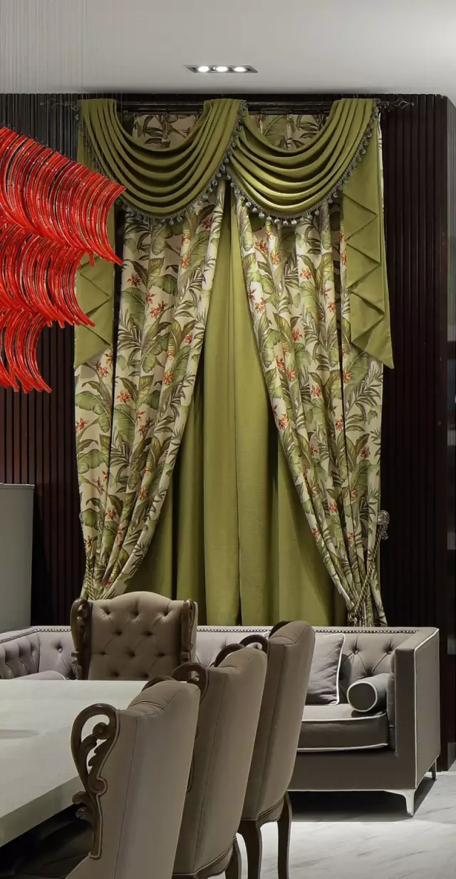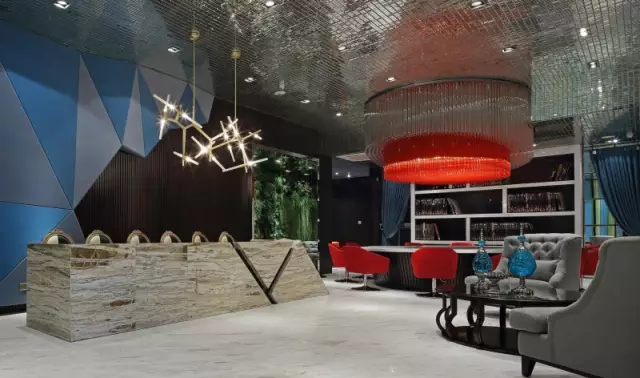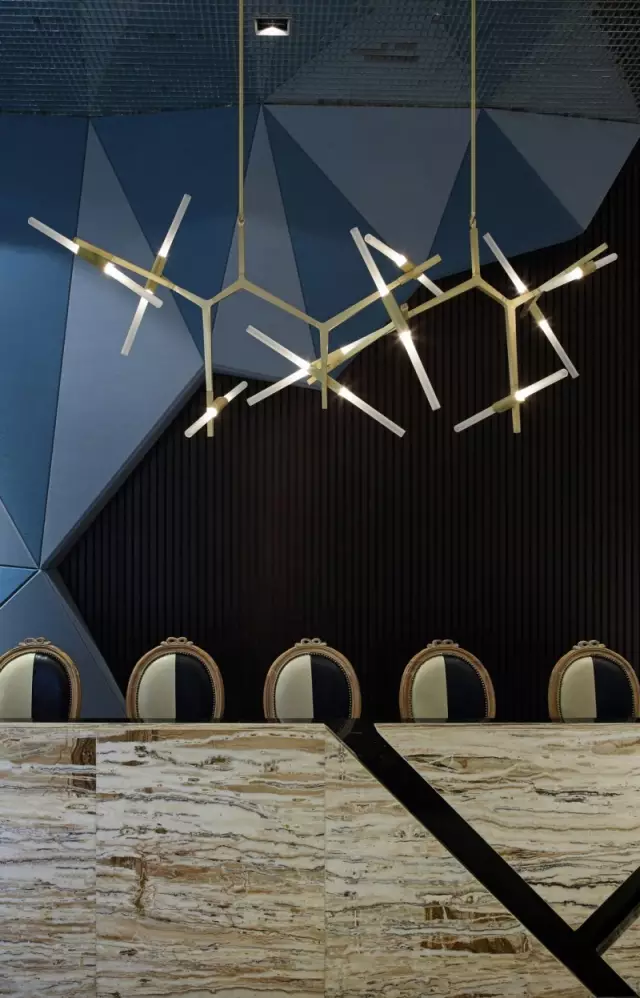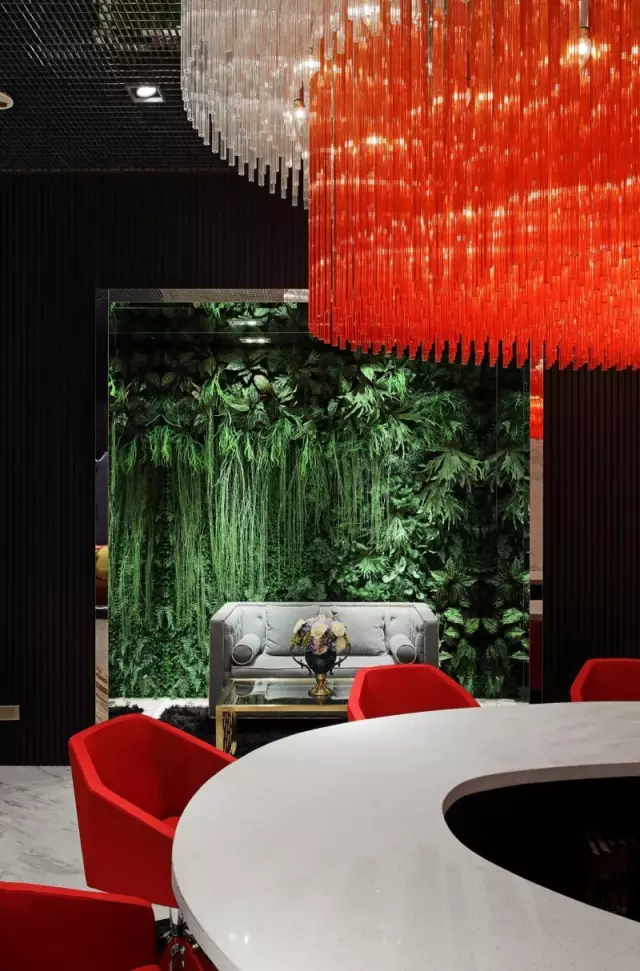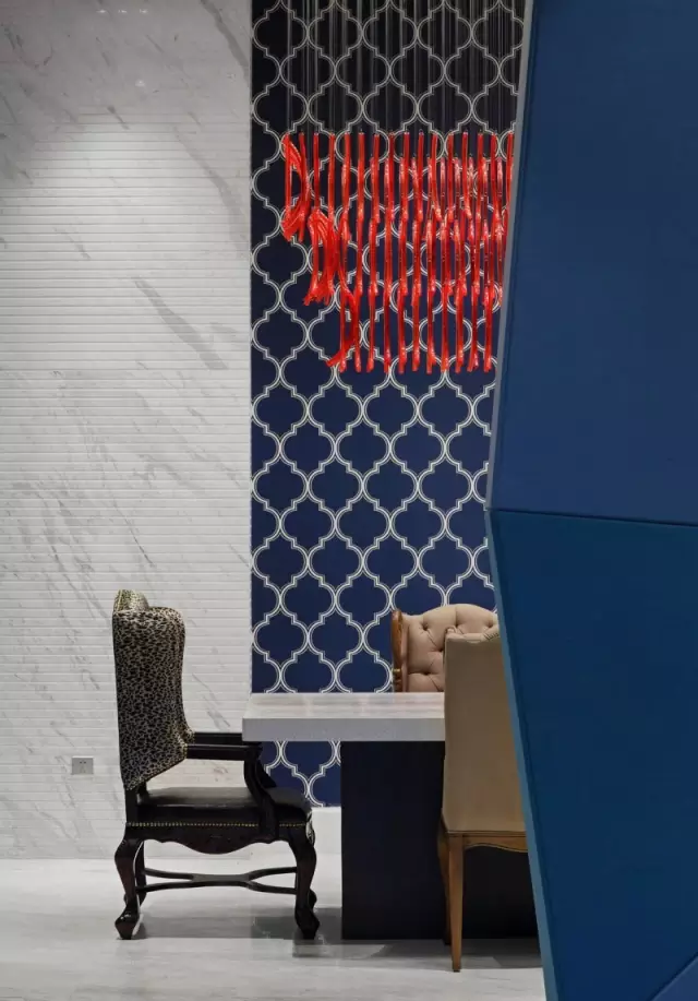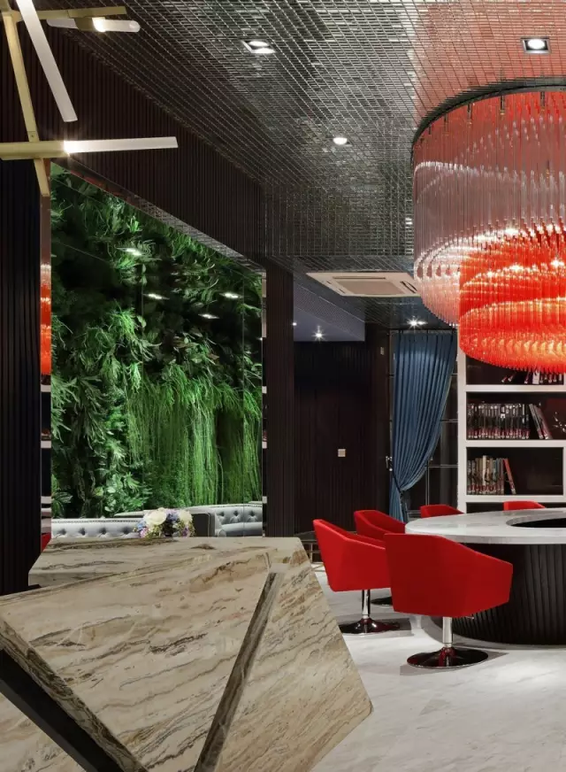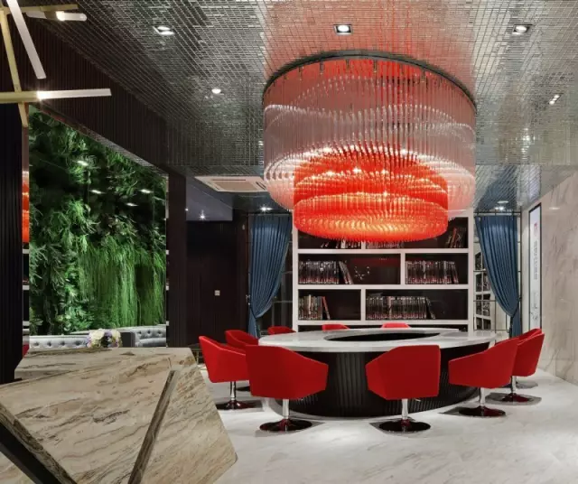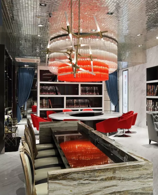 選樣區(qū)上方的巨大橘紅色吊燈極具視覺(jué)沖擊力,它是空間的“眼”,既滿(mǎn)足照明功能,又彌補(bǔ)頂面不平而形成的落差感;吊頂鋪貼鏡面馬賽克,擴(kuò)大視覺(jué)的延展性;背景的棕黑色木飾面散發(fā)出沉穩(wěn)氣質(zhì),在空間中看似不起眼,實(shí)則起到統(tǒng)籌色彩之間起承轉(zhuǎn)合關(guān)系的作用。